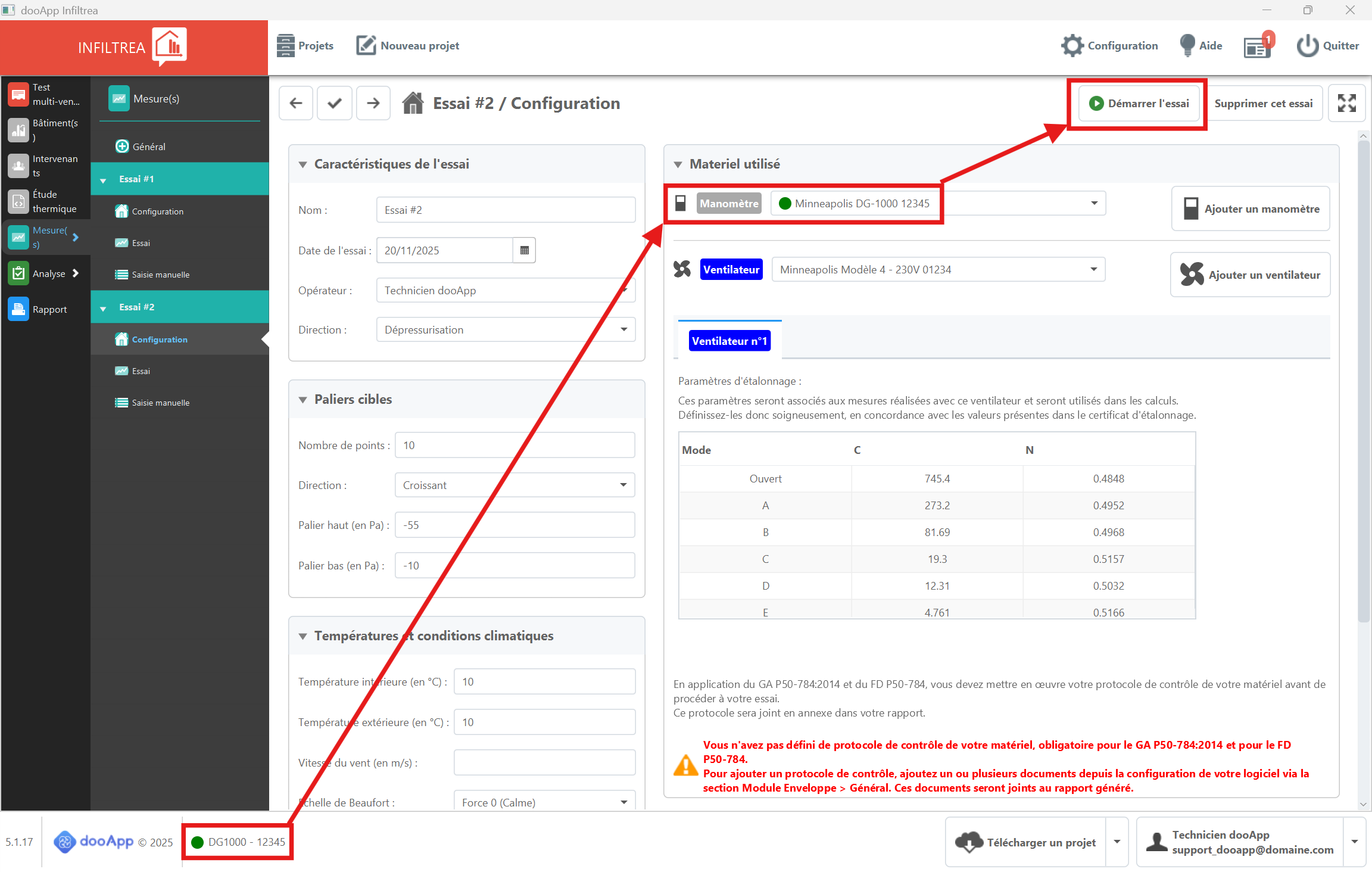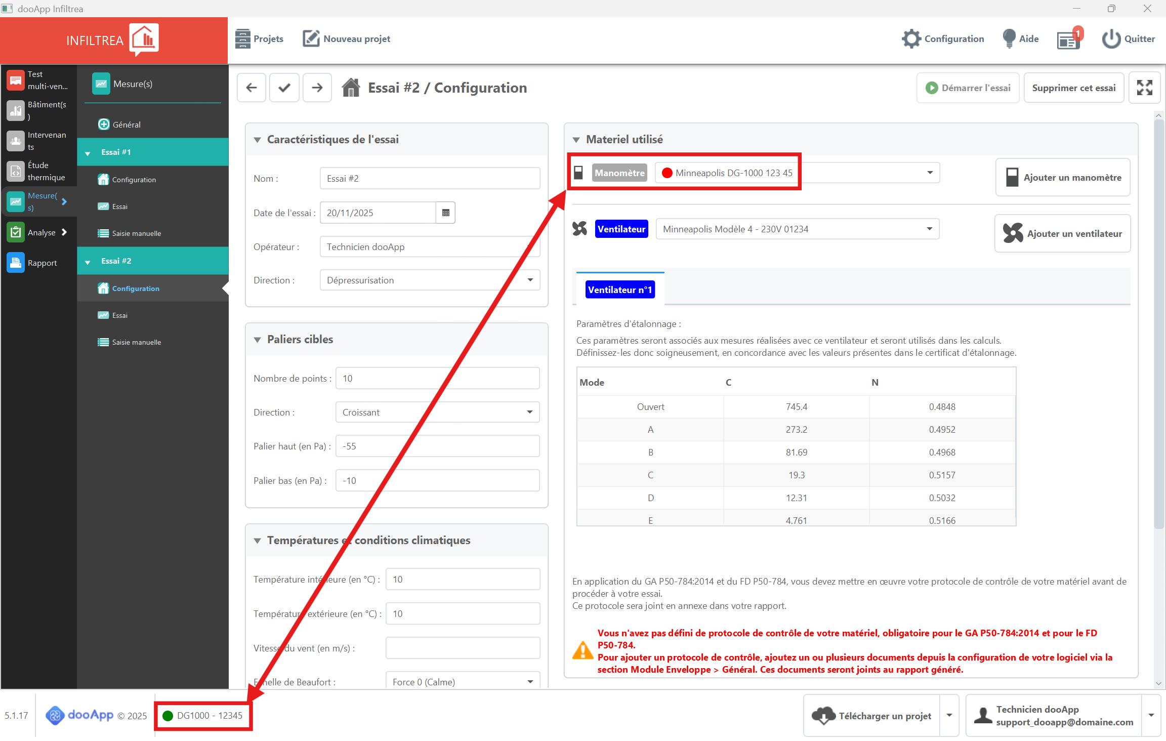 Depuis la version 5.1.17, le manomètre se connecte au logiciel via une reconnaissance du numéro de série transmis par le manomètre. Il faudra être très vigilant à cela car toute coquille empêchera votre essai de démarrer.