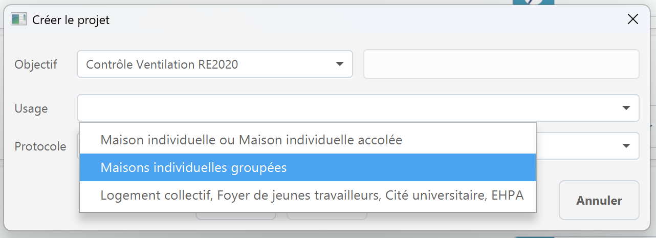 En l'absence d'une étude environnementale RSEE, créez un nouveau projet en sélectionnant comme usage "Maisons Individuelles groupées"