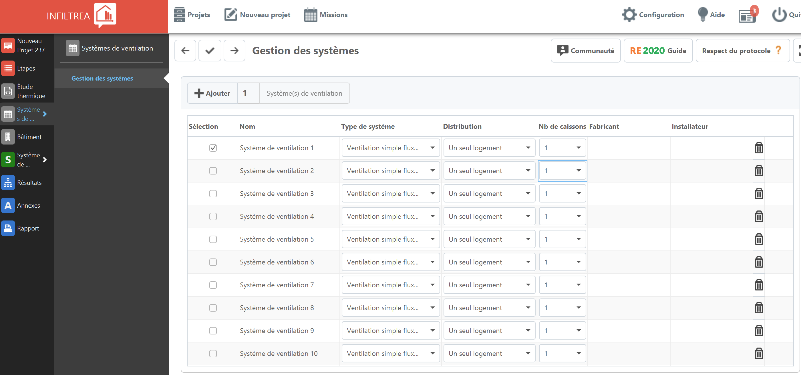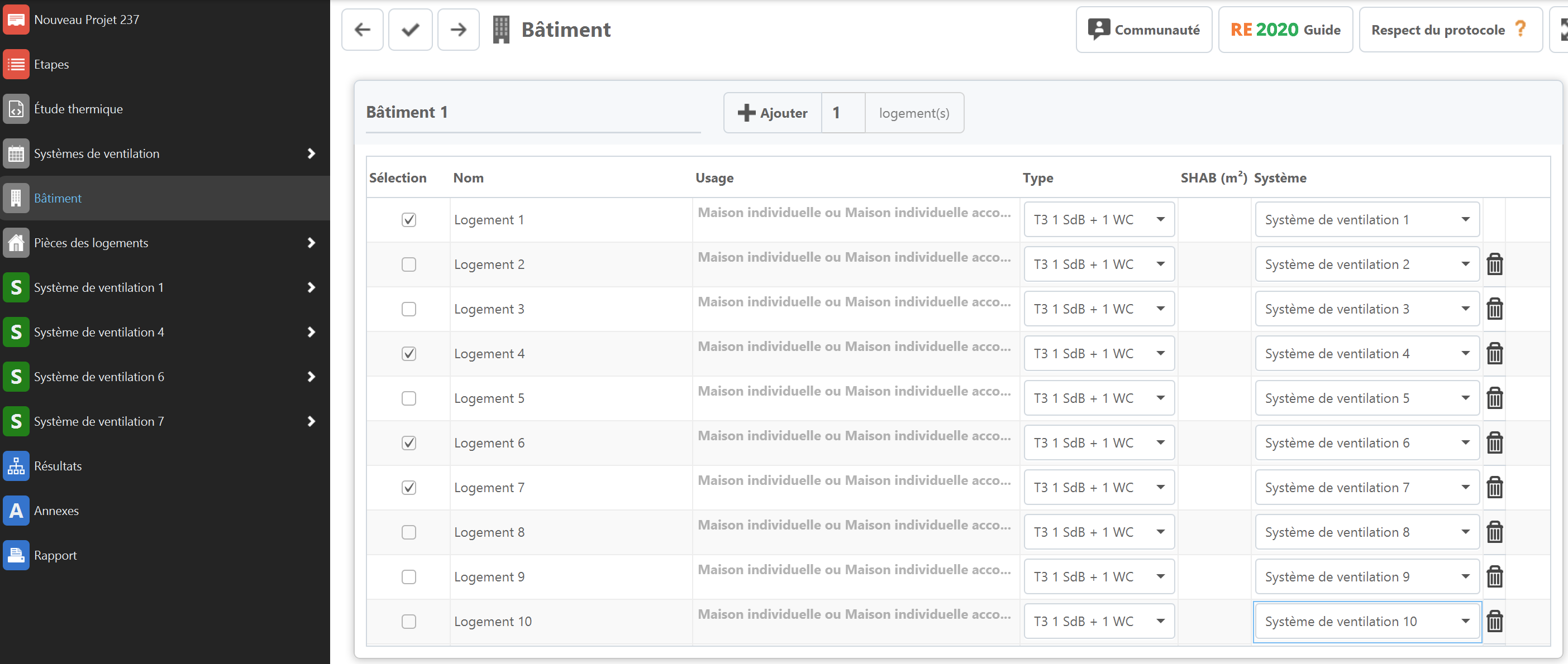 Créer ensuite les logements dans la section "Bâtiment", en associant à chacun le système de ventilation correspondant.
